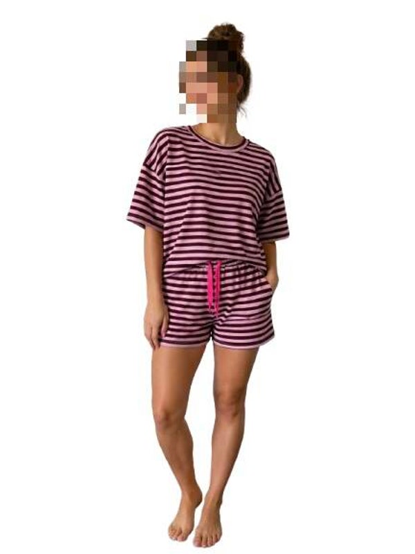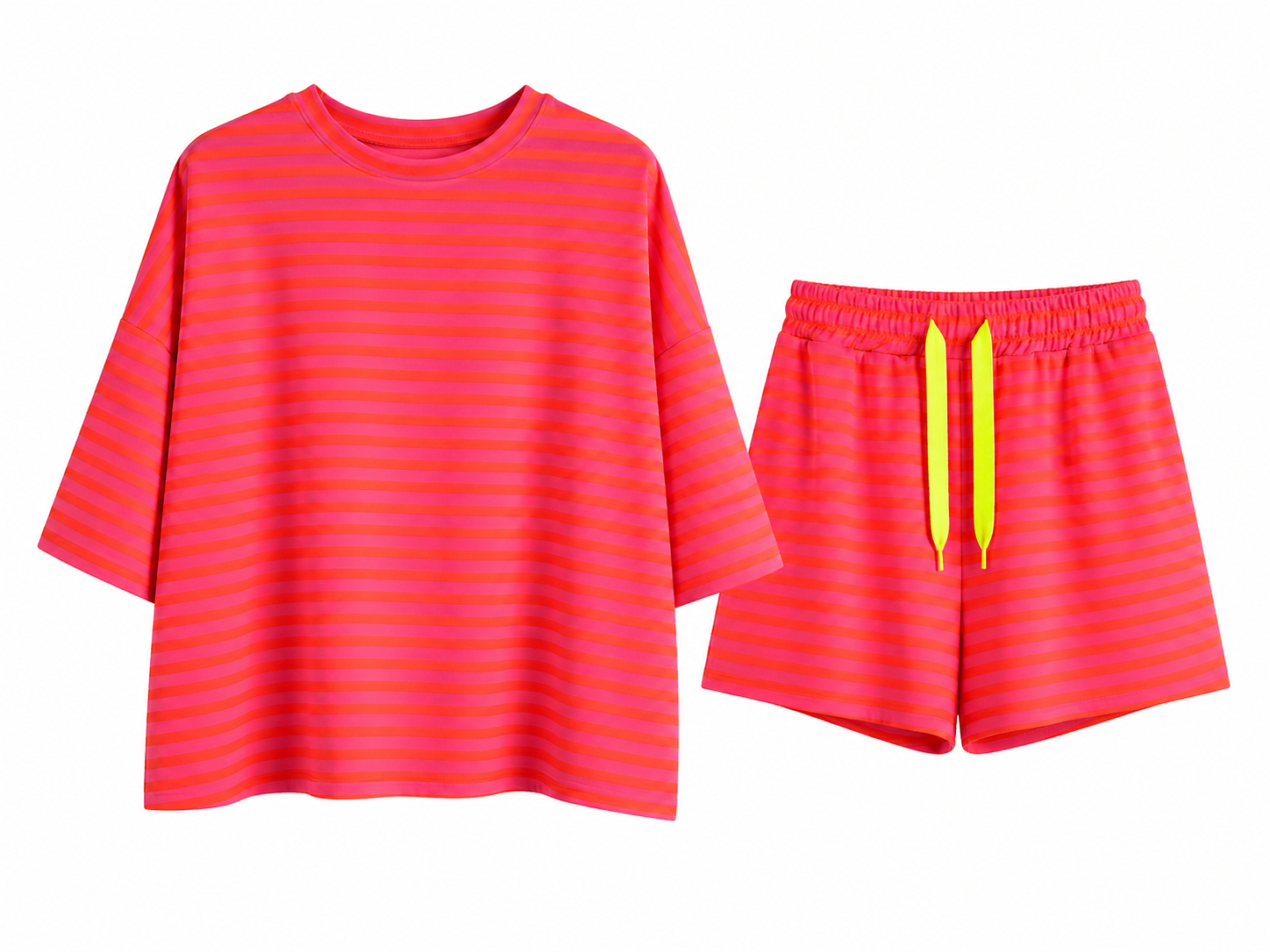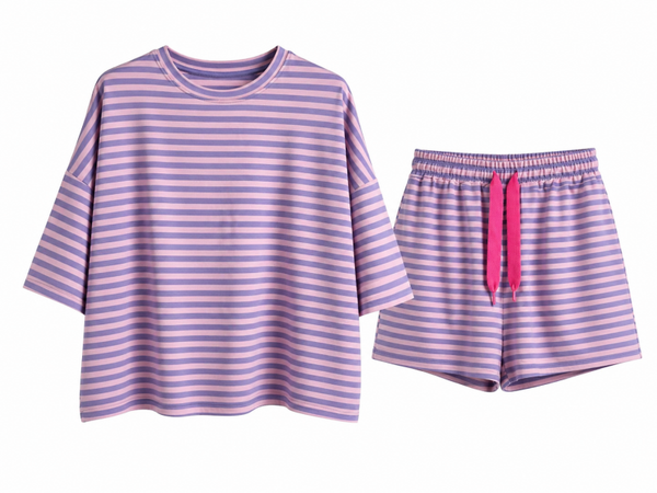 Comfortabele en stijlvolle lounge set met speelse streepprint. Deze tweedelige set bestaat uit een oversized T-shirt met korte mouwen en een bijpassende short met elastische tailleband en striksluiting. Uitgevoerd in zachte pastelkleuren roze en geel voor een frisse, zomerse uitstraling. Perfect om thuis te ontspannen, casual te dragen of mee te nemen op vakantie. Dankzij de luchtige stof zit de set heerlijk comfortabel.